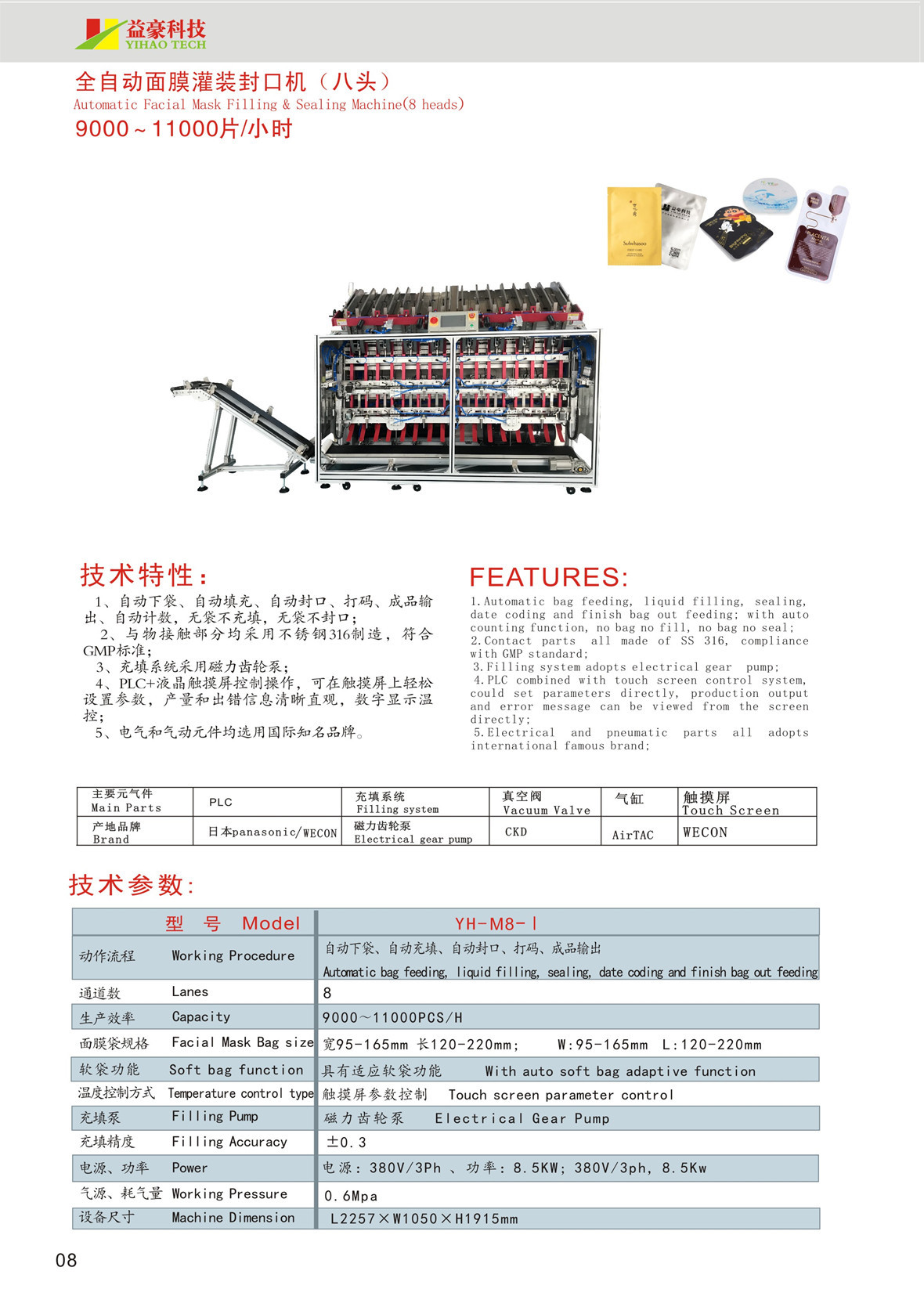 Automatic bag feeding, liquid filling, sealing, and finish bag out feeding; with auto counting function, no bag no fill, no bag no seal;